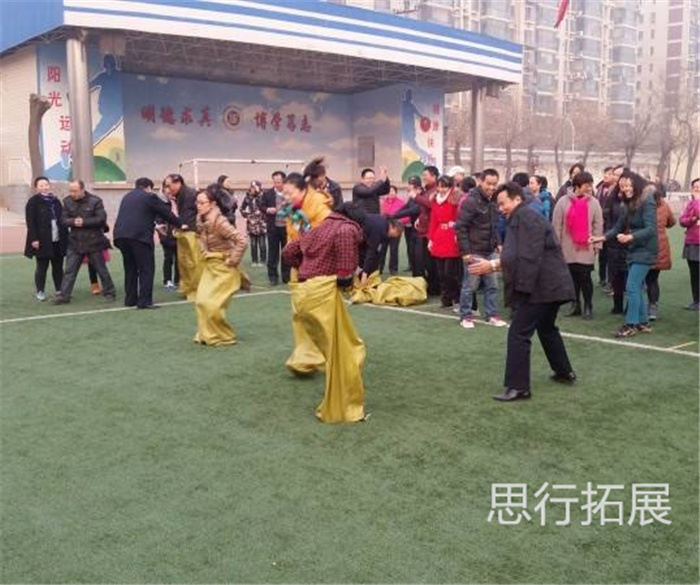 項目規則:參參賽隊員成一路縱隊站在起跳線后。 比賽開始,第一人站在跳袋內,手提跳袋的帶子 向前跳出,繞過標志物返回并將跳袋交給第二人, 依次進行,以先跳完的隊為勝。
